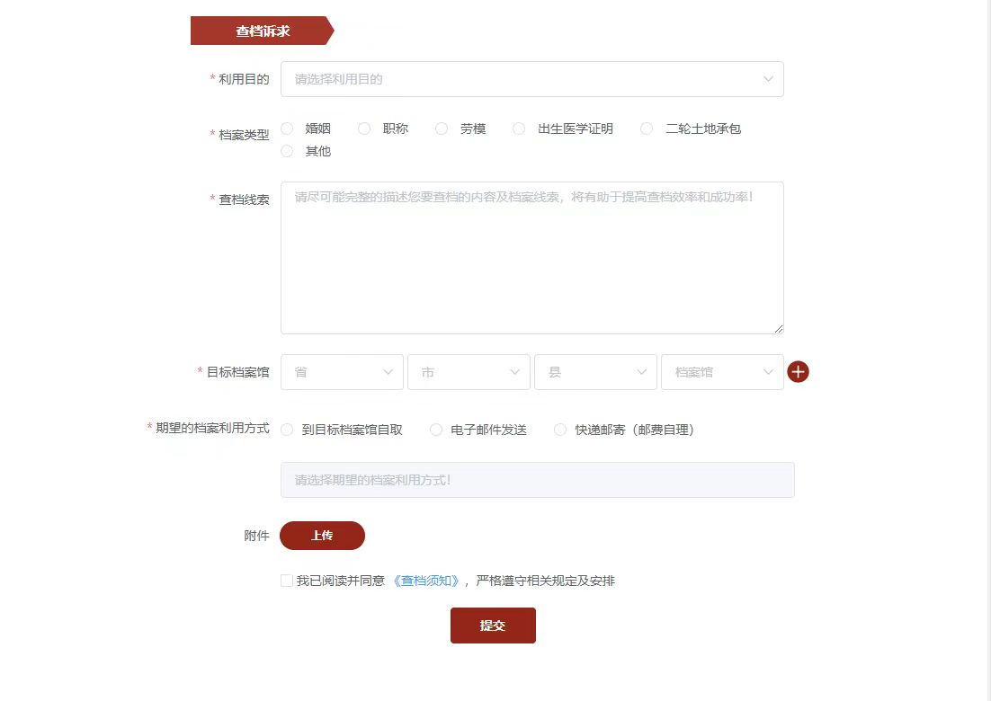 4.期望的档案利用方式有三种方式可以选择,查档人可根据需求自由选择:到目标档案馆自取、电子邮件发送、快递邮寄(邮费自理)。