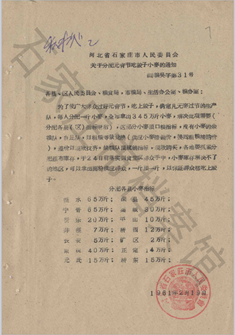 在石家庄市档案馆还保存着一份题为《关于分配元宵节吃饺子小麦的通知》的档案,这份通知发布于1961年2月19日。当时国家正处于三年困难时期,物资极度匮乏,粮食供应尤为紧张。这份通知篇幅不长,通篇围绕一个主旨,要让“广大群众过好元宵节,吃上饺子”。从字里行间可以看出,即使在最困难的时期,党和政府依然牵挂着群众的节日期盼。这碗来之不易的元宵饺子,承载着全体石家庄人民共克时艰的坚定信念。